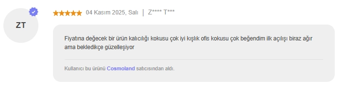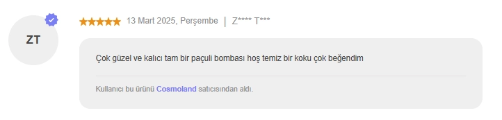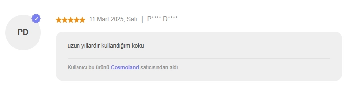 Temel notalar: Vanilya, Misk, Paçuli, Vetiver.