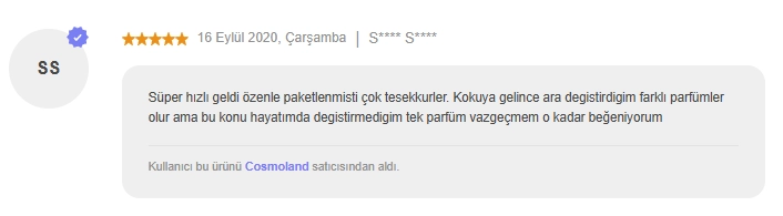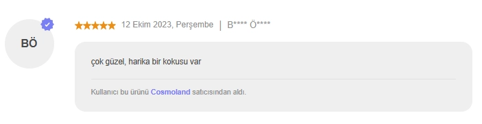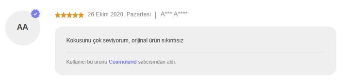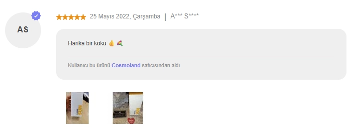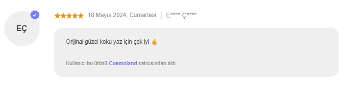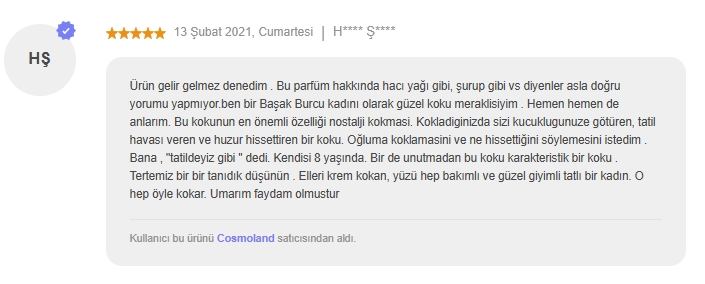 Ürün gelir gelmez denedim . Bu parfüm hakkında hacı yağı gibi, şurup gibi vs diyenler asla doğru yorumu yapmıyor.ben bir Başak Burcu kadını olarak güzel koku meraklisiyim . Hemen hemen de anlarım. Bu kokunun en önemli özelliği nostalji kokmasi. Kokladiginizda sizi kucuklugunuze götüren, tatil havası veren ve huzur hissettiren bir koku. Oğluma koklamasini ve ne hissettiğini söylemesini istedim . Bana , ''tatildeyiz gibi '' dedi. Kendisi 8 yaşında. Bir de unutmadan bu koku karakteristik bir koku . Tertemiz bir bir tanıdık düşünün . Elleri krem kokan, yüzü hep bakımlı ve güzel giyimli tatlı bir kadın. O hep öyle kokar. Umarım faydam olmustur
