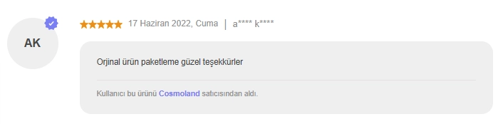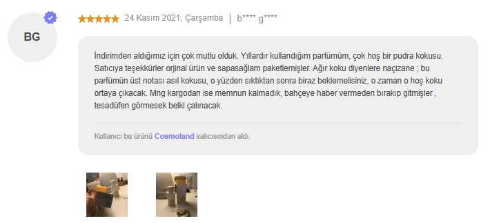 İndirimden aldığımız için çok mutlu olduk. Yıllardır kullandığım parfümüm, çok hoş bir pudra kokusu. Satıcıya teşekkürler orjinal ürün ve sapasağlam paketlemişler. Ağır koku diyenlere naçizane ; bu parfümün üst notası asıl kokusu, o yüzden sıktıktan sonra biraz beklemelisiniz, o zaman o hoş koku ortaya çıkacak. Mng kargodan ise memnun kalmadık, bahçeye haber vermeden bırakıp gitmişler , tesadüfen görmesek belki çalınacak.