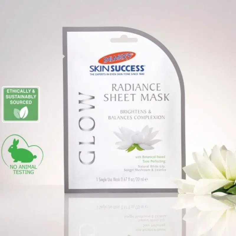 Palmer's Skin Success GLOW Radiance Sheet Mask ile cildinizi dengeleyin, aydınlatın ve hatta eşitleyin. Doğal Beyaz Zambak, Japon Soyngyi Mantarı ve Meyan Kökünün botanik bir karışımı, cildin aydınlık, sağlıklı görünen ışıltısını arttırır.